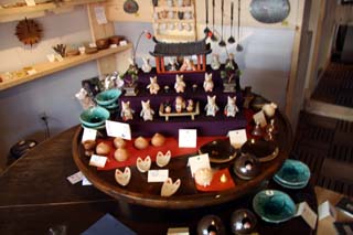 店内には地元名産の栗と笠間稲荷のキツネをテ−マにした工芸品のほか、洋菓子店特製のクリ菓子も販売しています。