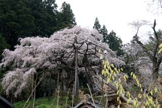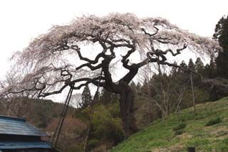 その片隅に老木しだれ桜があり、推定樹齢は約500有余年、中央部が朽ち果て無残な姿ではあるが四方に伸びる枝は隆々と逞しく、地域の有志が支柱を施して管理している。
