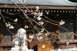 右の写真は神社入口にある大島桜で満開です、ただ背が高く他の樹木に混ざって見過ごしてしまいます。黒いゲートの前で空を見上げて下さい。