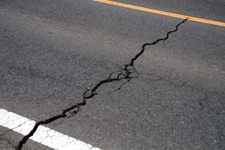 道路には地割れ、屋根にはブルーシートが張られています。
