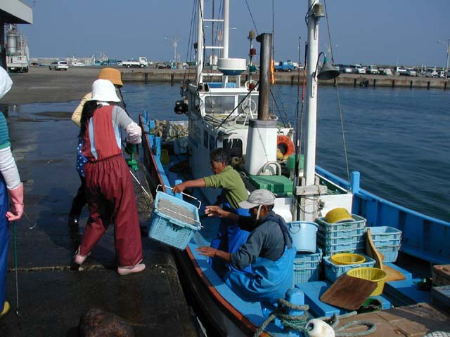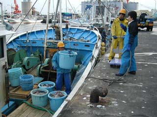 夕方底引き船が帰ってくると、水揚げ、仕分け、セリ、箱詰めなどあわただしく作業が進められます。