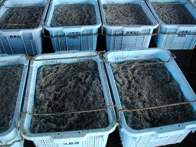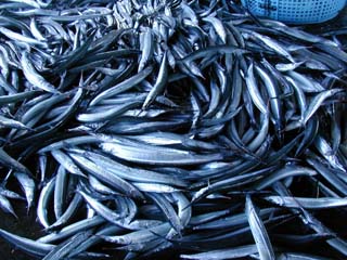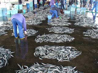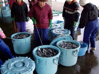 朝5時頃出漁したサヨリ船は午後2時頃帰港し、あわただしく選別され、セリにかけられます。