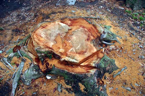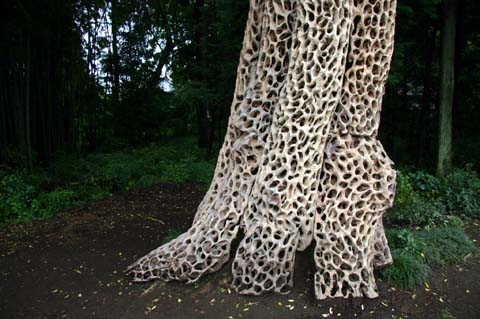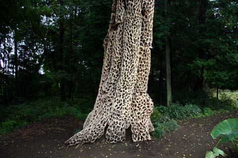 いたずらか芸術か、きれいだった大木の肌が蜂の巣状になってしまった。