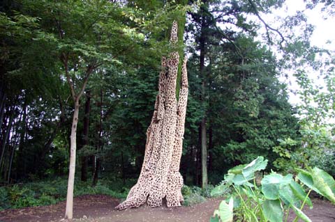 雨引の里と彫刻2008(4)安田正子・植物のかたちー木の果実ー 素材:欅 畑の中に設置
