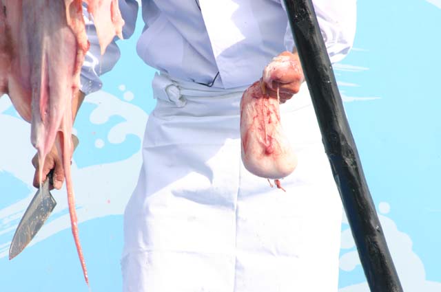 重さ12〜13kgの大物です。ところがこのあんこうの腹をみると膨れていない、へこんでいます。