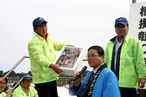 トロ箱に氷詰めされた各種お魚が橋本県知事、豊田市長・・・の手捌きにより次々と競り落とされます。