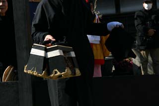 御輿に御霊を納め、神官の挨拶、幹事長の挨拶があります。