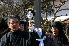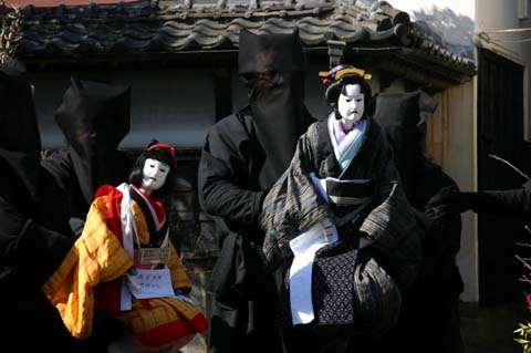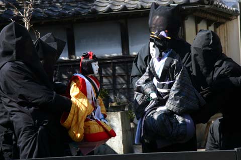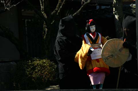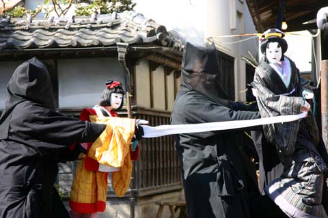 人形の首、表情、右手を操作する「主遣い(おもづかい)」、