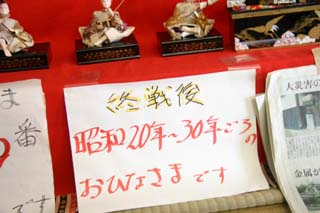桜井精肉店では昭和28年の御殿雛、昭和35年の内裏雛が飾られていました。