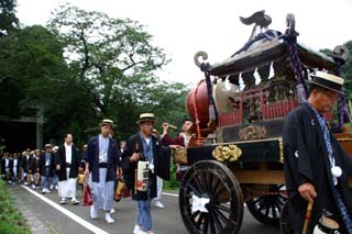「出発」の合図と共に、行列と御輿が町内の御仮屋に向かって出発します。