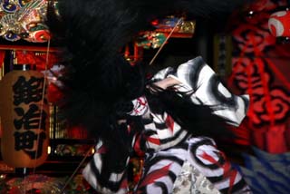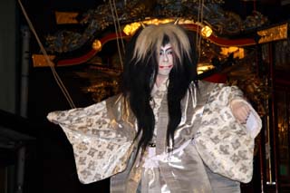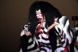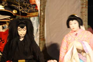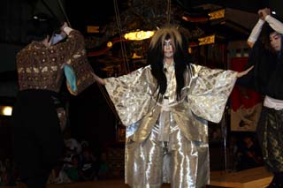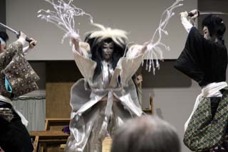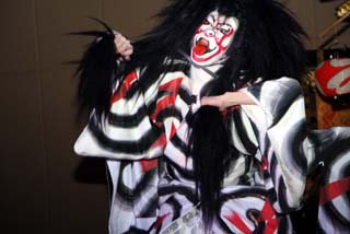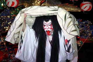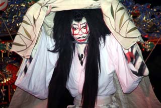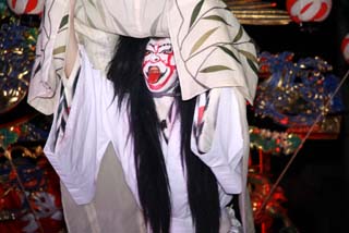 この演目は現地烏山山あげ祭りでよく演じられる”鬼の妖怪”もので人気のある演目です。鬼が長い髪をグルリングルリンとまわすと観客から拍手が送られます。