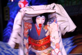 本性が妖怪である滝夜叉姫は序の幕の部分で、楊貴妃のような美女、京の島原の傾城「如月」と名乗って登場し、光圀を口説きにかかる。しばし、如月と光圀の戯れが展開し、通常なら美女の口説きに鼻の下が伸びるところですが、光圀は逆に反撃し、如月は正体を見破られ、妖怪である滝夜叉姫を表し光圀と大立ち回りを演じたのち背景の大山に逃げてしまいます。