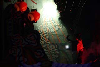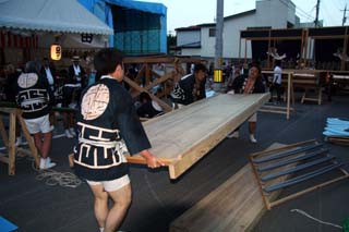 舞台中は、桜を咲かせたり、煙を出したり。舞台が終わるとすぐさま解体にかかり、屋台を先回りして次ぎの町内まで材料を運搬し再度組立が行われます。