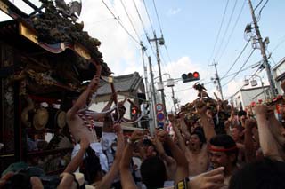 5台の屋台が交差点を取り囲むように対峙し、笛太鼓や鉦を激しく打ち合います。