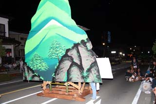 山あげ祭の「山」は歌舞伎舞台の背景で路上100メートルの間に大山・中山・前山・館・橋などが配置され、舞台の進行によって、緑の山に桜の花が咲いたり、滝が流れ、稲妻がとどろいたり舞台を盛り上げる装置です。