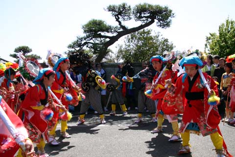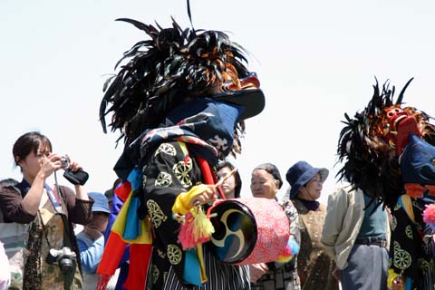 舞の構成は、大獅子、中獅子、雌獅子の3頭と華やかに飾り付けられた「しゃぐま」が2〜4人、このほかに金棒ひき、しの笛と警護が数人つきます。