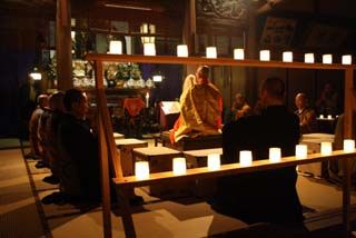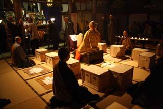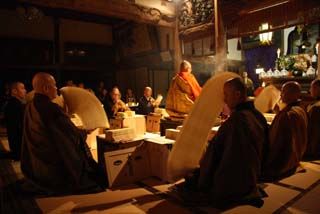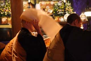 後に一般参詣者はご本尊の前に進み、一人の僧侶が般若経をパラパラと転読することにより起こる「般若の風」にあたり、焼香をし、さらに有難い潅頂(かんちょう, 頭を少量の水で注いで清める儀式)を受けます。