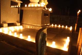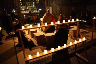 境内の細い棚にアレンジされた300ものロウソクに点灯されます、5時。