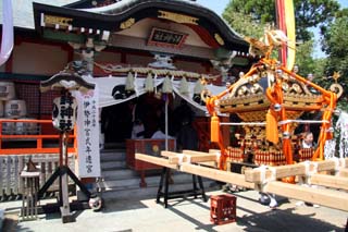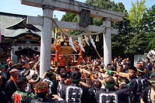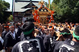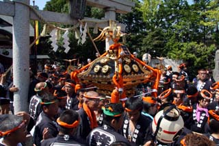鳥居をくぐるときには肩から下ろし、金の鳳凰が引っかからないように無事にくぐり抜ける所作が見ものです。