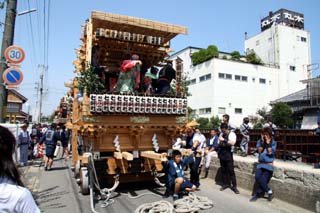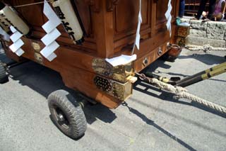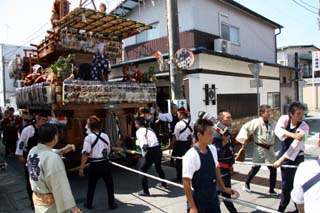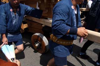 頂上部に人形がなく、車輪は木製のコマ、前曳きには子どもたちやお姉さんが担当し、後押しは屈強な若者が担当しています。