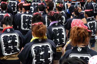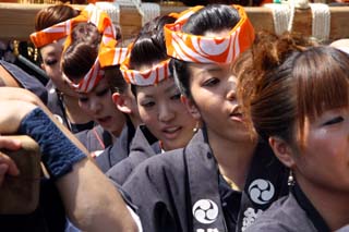 (右)神輿を担ぐ女性の勇姿勢揃い。