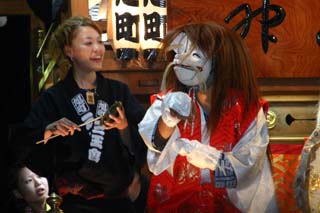 (右)山車の前で白狐やひょっとこが踊るのは茨城県南の山車でよく見かけます。