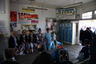 (右)神輿巡幸の途中、関東鉄道鉾田駅構内でお休みします。但し現在この駅舎は鉄道の廃止とともに解体されました。