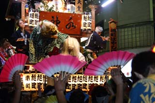 囃し手は両サイドに陣取り、後背部では太鼓をたたいています。