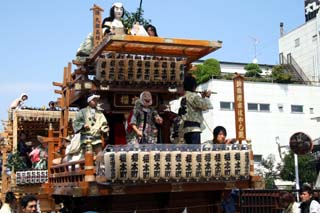 (左)山車の上に日本武尊などの等身大の人形が乗る形式は潮来祇園祭の山車でも見られる光景です。