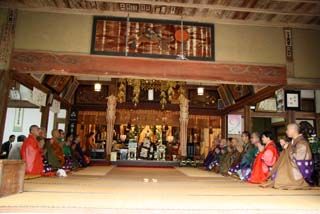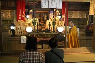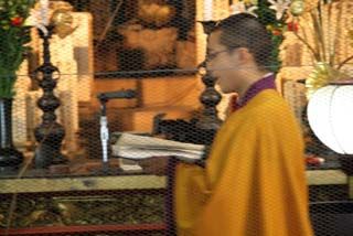 午前12時からの法要のあと、常行三昧会がはじまり、四人の若い僧侶が常行堂内の阿弥陀仏の周りをゆっくりと歩きながら読経し、阿弥陀仏の正面では拝礼してのち立行読経を続けます。2時間おきに後退しながら七日七夜途切れることなく読経が続けられます。