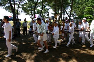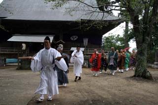 また奉仕者7人の白い衣装に黒い烏帽子は、金砂大祭礼の折の神輿の担ぎ役と同様で、平安時代の形式といわれています。