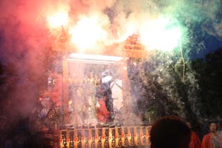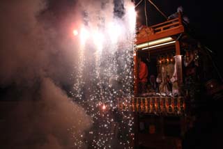 山車の屋根に上った若者が竹竿に花火をくくりつけ山車の前面に垂らすと、頃合いをみて導火線に点火、たちまちの内に滝花火が出現します。赤い火花から白い火花への変化がすばらしい。