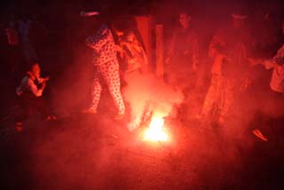 夜の帳が下りる頃、門付けのお礼にひょっとこ踊りの最中、山車の上から花火が焚かれます。