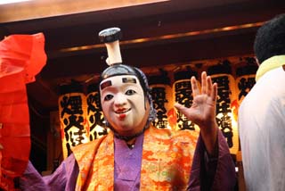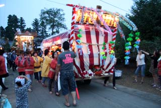 祭りの日、山車が一台と獅子山車が繰り出し、「シンバカ」「シチョウメ」「ミンバ」で囃しつつ、山車の上で「獅子舞」「キツネ踊り」「ひょっとこ」「おかめ」が踊られます。