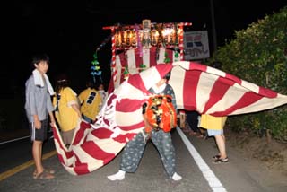 門付けに際しては、家人が酒やビール、ジュースの箱入りを提供し、祭役員が花火セットとタオルをお礼に返したのち、山車の上部を90度回して、家人に向ってお礼におかめ踊りなどを踊ります。この間道路は通行止め。