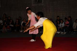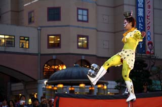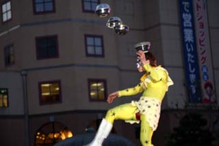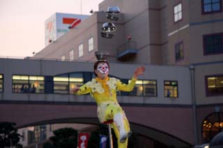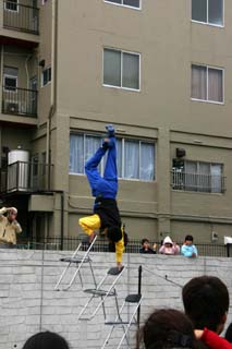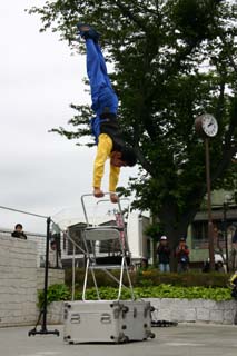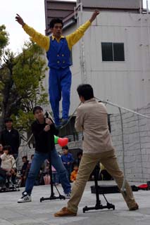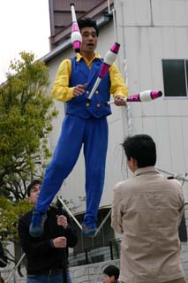 背の高い一輪車を操りながら、重ねたボールを蹴り上げて、頭の上に重ねる不思議な妙技、喝采。