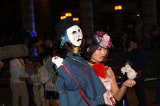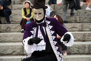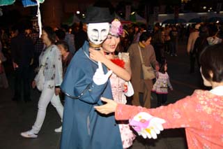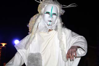 キツネのお面をつけた寂しげな美人が観客の間をゆっくりと通ります。
