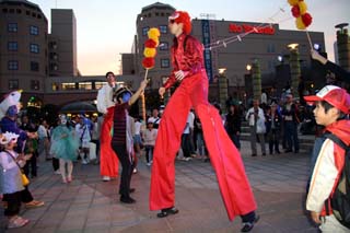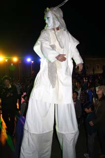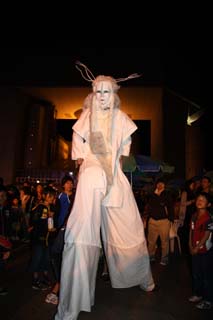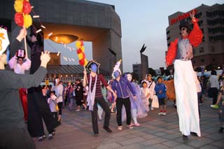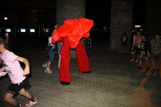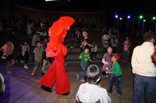 どうして立っていられるのか、スネの長さ2メートルの巨人が縄跳びやリンボーダンスを披露し、暮れなずむ広場をノッシノッシと闊歩、子供たちが後を追います。