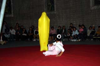 大きなツボを頭の上で回したり、高く放り上げて首で受け止めたり、「痛い!」と思われる妙技。