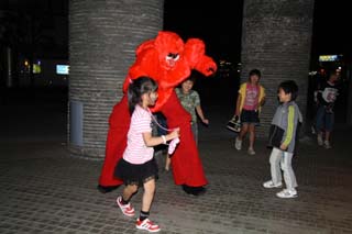 広い新都市広場内で赤いゴリラが子どもたちを追っかけます。