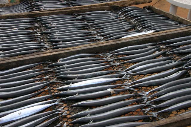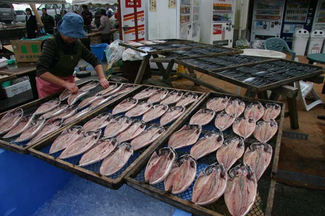 那珂湊おさかな市場内でひものを作って販売していました。