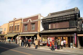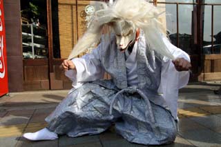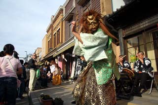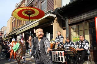 レトロな建物の前で中町囃子が披露され、目の前に迫る狐面に子供たちは驚き、おばあちゃんはひょっとこの頭を撫でるなど楽しい交流の一コマがありました。