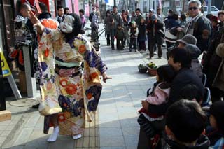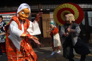 曲と踊りの演目は、おかめ(四丁目しっちょめ)、ひょっとこ(仁羽みんば)、きつね(新馬)があり、面をつけた踊り手が面白おかしく踊ります。