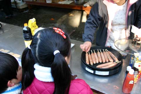 ファーストフードも豊富で安い、やきそば、フランクフルト、赤飯、アユの塩焼き、おにぎりなど