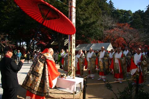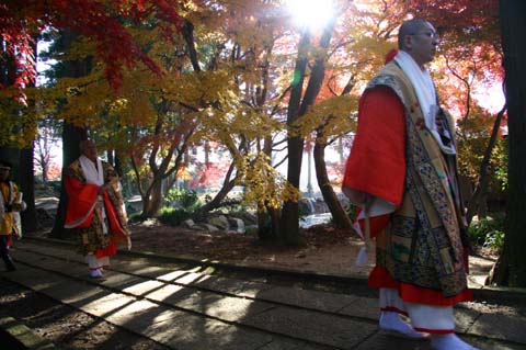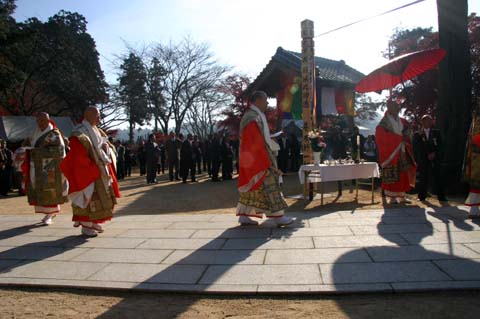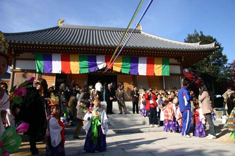 黄赤の彩りの参道を稚児たちが行列をして本堂へ向かい、境内で高僧が読経し本堂にて落慶法要が行われました。