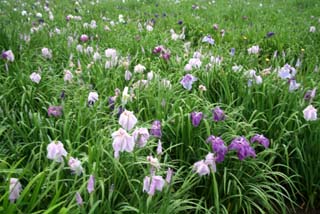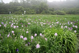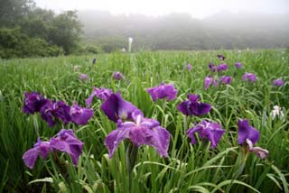 雨に遠景が白くかすみ、幽玄な雰囲気の中に花菖蒲が優雅に咲いていました。
