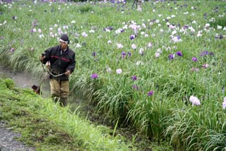山崎さんが朝5時から草抜き作業を行なっていました、「今週末は花しょうぶ祭、きれいな花を見て欲しい」。