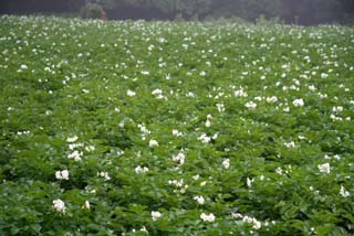 隣の畑のジャガイモも満開、農家の庭先にはトリトマがエキゾチックな彩りを添えています。
